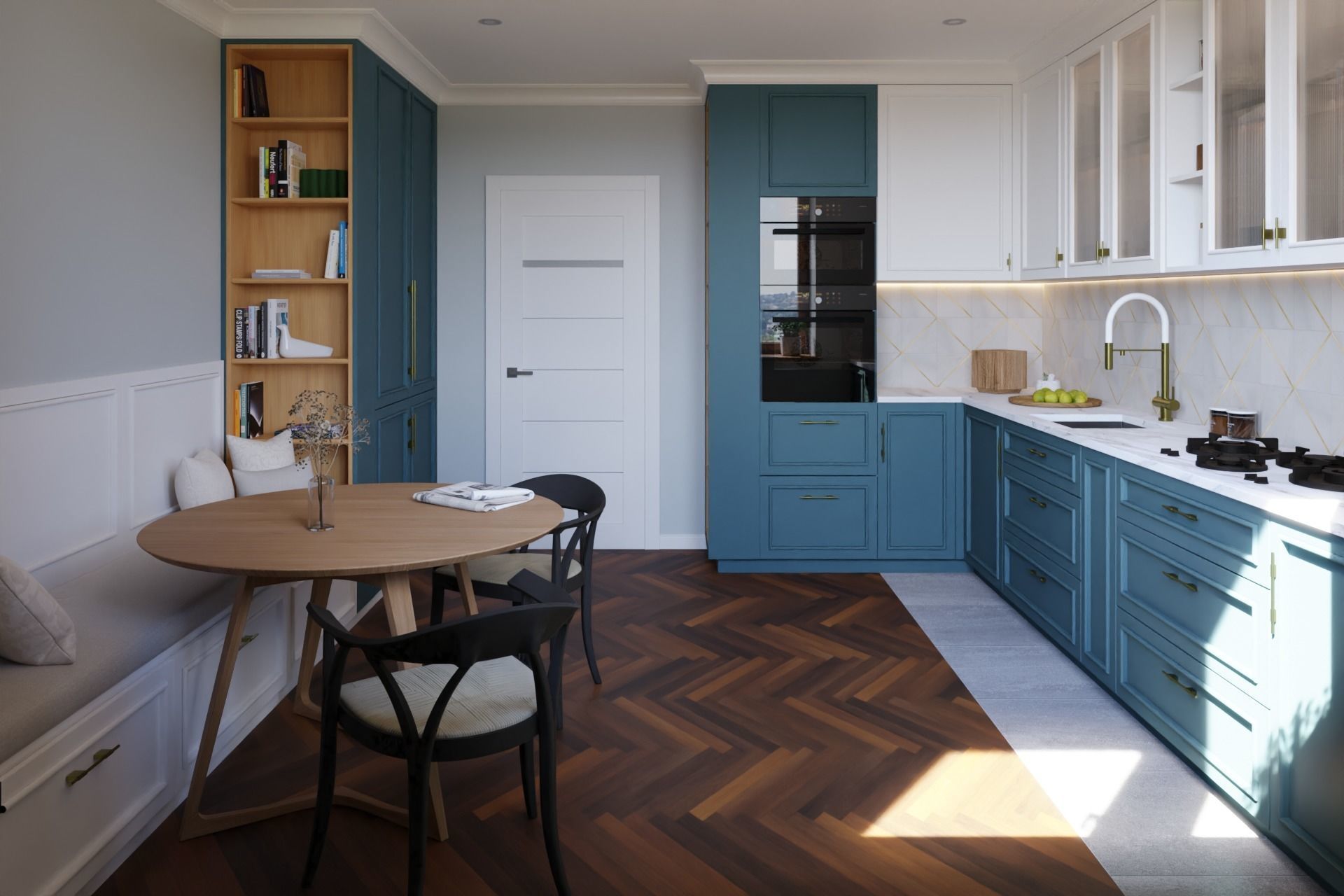 This offers an elegant combination of traditional and modern design. The lower cabinets are in vibrant blue, while the upper cabinets are in simple white. The Shaker-style doors create a warm and inviting atmosphere in the kitchen.