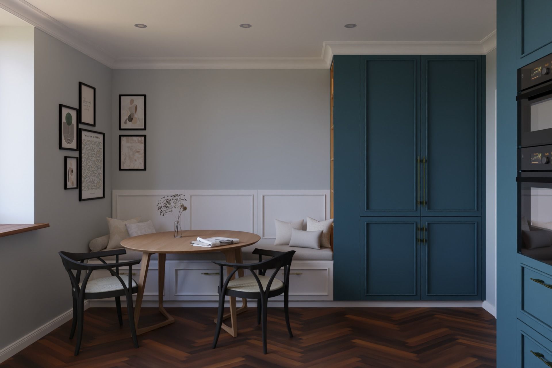 The golden yellow handles complement the elegant harmony of blue and white and create a warm accent in the kitchen. The Silva kitchen model enhances your living space by combining elegance and functionality. It offers both food preparation and a pleasant seating area.